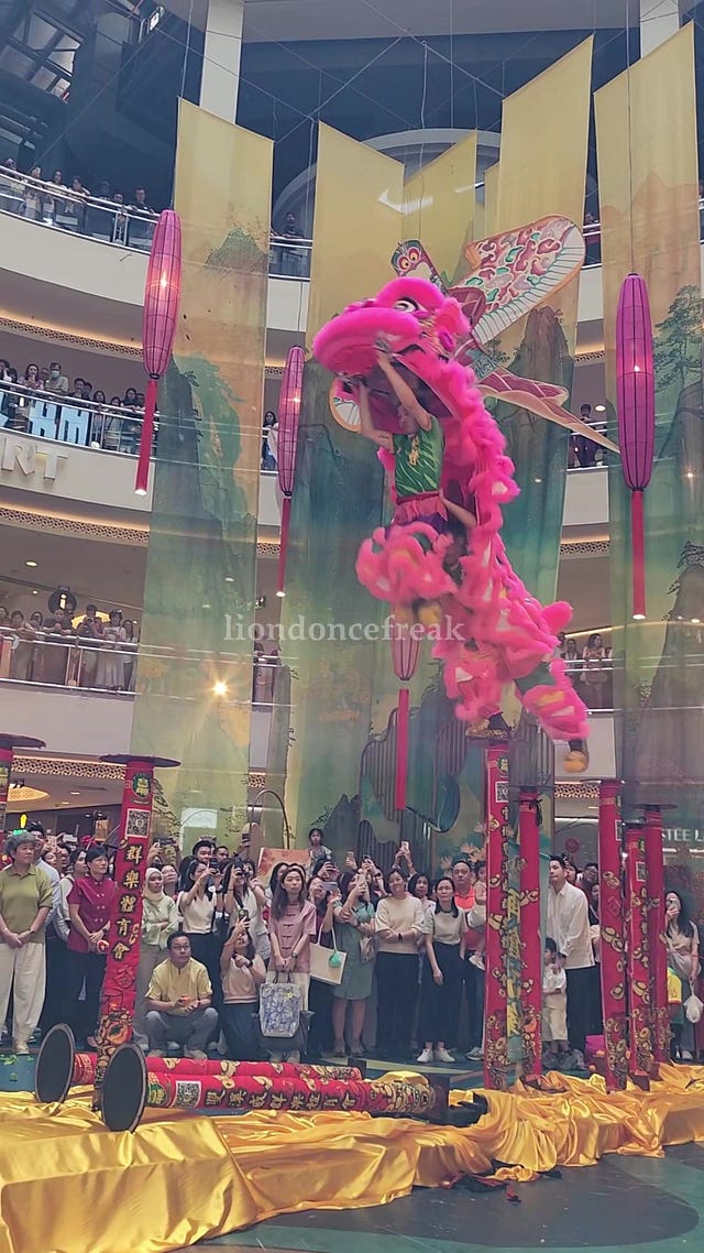 For example, I’ve only recently learned that lion dances performed on poles were created by the Malaysian Chinese diaspora. A fairly recent invention too—first appearing in 1983, in comparison to the 2000 years it’s been around as a practice. Yet this new style of performing the lion dance was quickly accepted and incorporated into performances and competitions.
